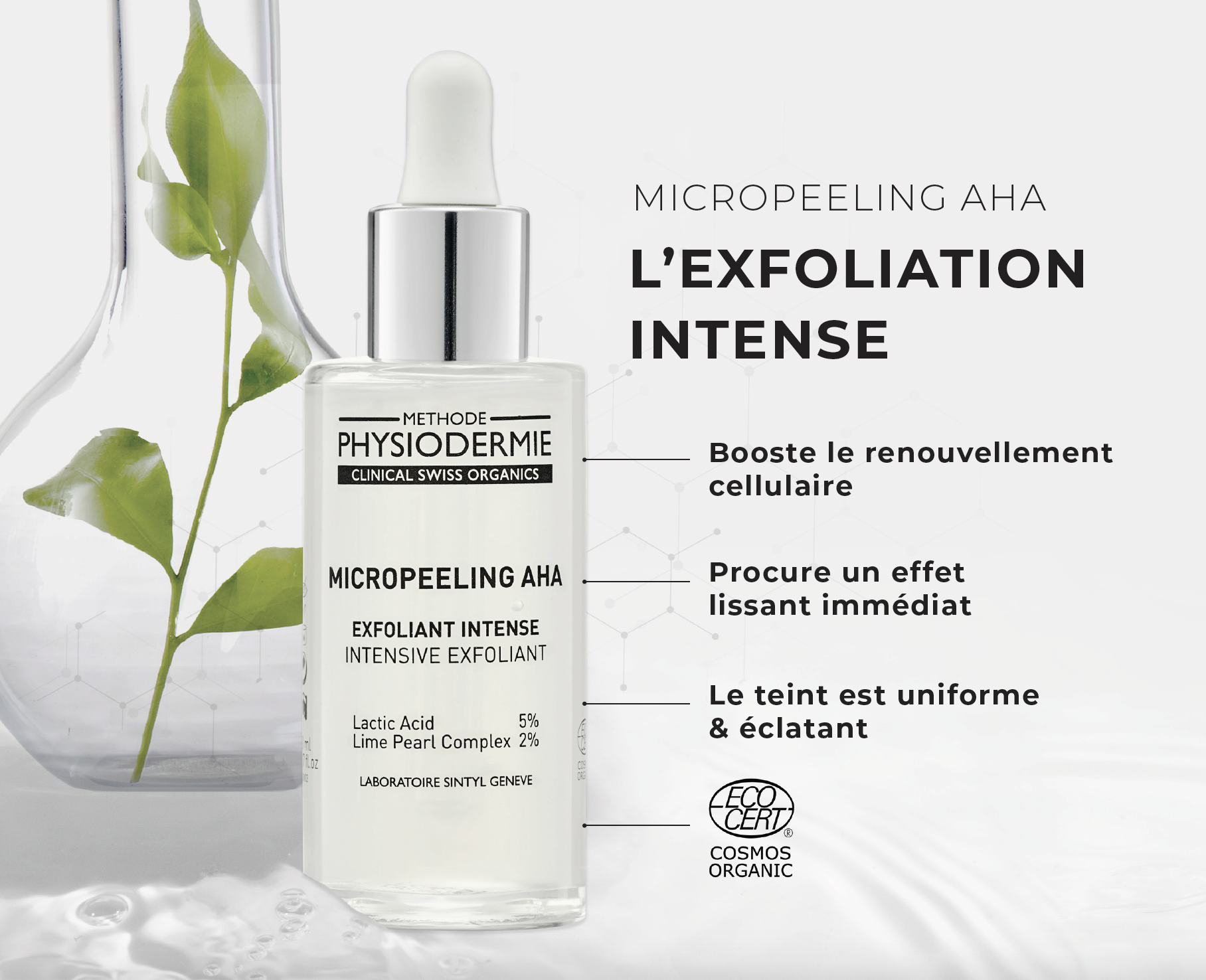 Ce soin est réalisé avec la gamme de cosmétiques Bio Clinical Swiss Organics (Laboratoire Methode Physiodermie depuis 1974) élaborée à Genève à quelques rues du cabinet. Elle ne contient aucun parfum, silicone, parabène, huiles minérales, ni EDTA/BHA/BHT. Le nettoyage profond est obtenu grâce au micropeeling certifié Bio par Ecocert Greenlife (selon le référentiel COSMOS Organic) Il est à base d’acide lactique naturel qui élimine les couches superficielles de l’épiderme tout en préservant le microbiote cutané. Il est particulièrement adapté aux peaux ultra fragiles qui ne supportent plus d’agression mécanique comme les gommages à grains.